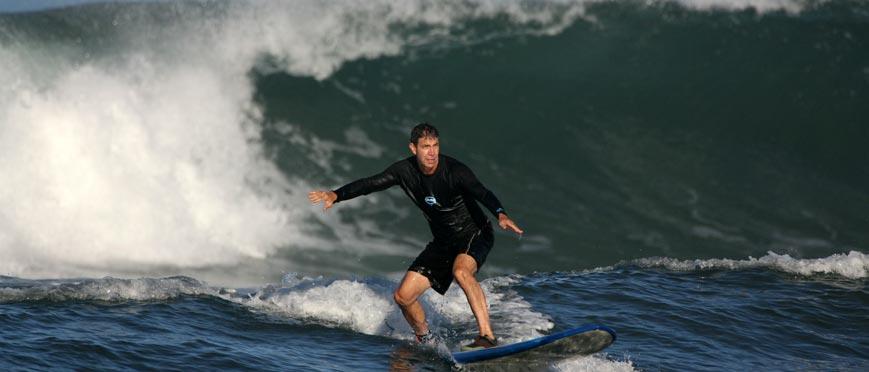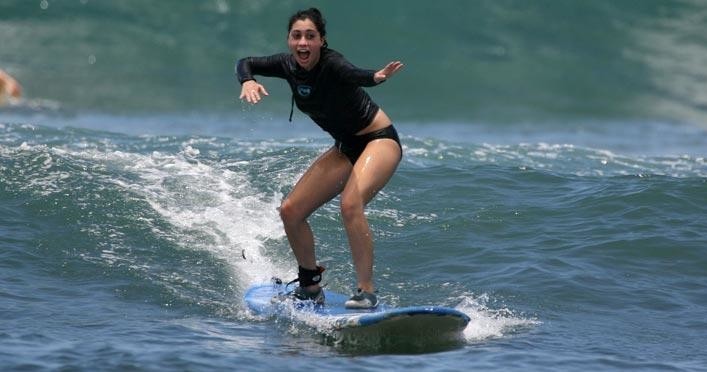 As a first step in their beginner group lesson, our students are outfitted with modern soft longboards, surfing booties, and a protective lycra t-shirt. Next we proceed to the beach, where the first half hour or so of your lesson is taught on the sand and in the flat water. The rest of your time is spent surfing in the warm water. Students are supervised and coached at all times!